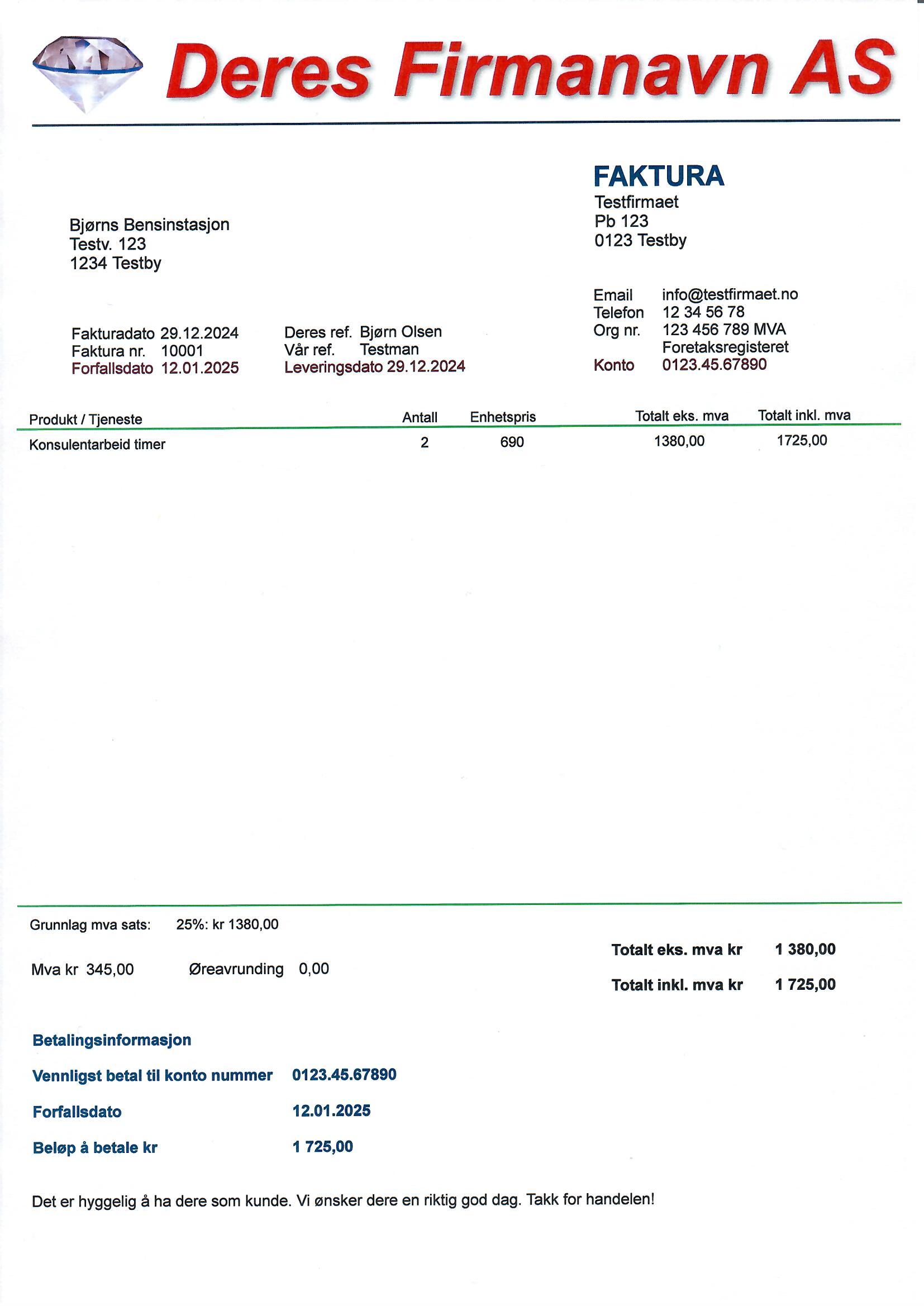 Hei. Først må jeg få lov til å takke for et kjempebra og lettfattelig fakturaprogram, som jeg anbefaler alle jeg kjenner. Servicen har vært meget god og programmet har fungert upåklagelig.
